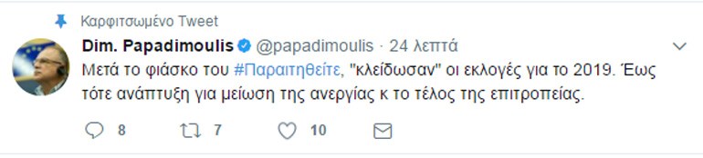 «Μετά το φιάσκο του #Παραιτηθείτε, “κλείδωσαν” οι εκλογές για το 2019. Έως τότε ανάπτυξη για μείωση της ανεργίας και το τέλος της επιτροπείας», αναφέρει στην ανάρτησή του.