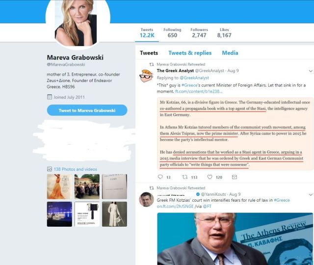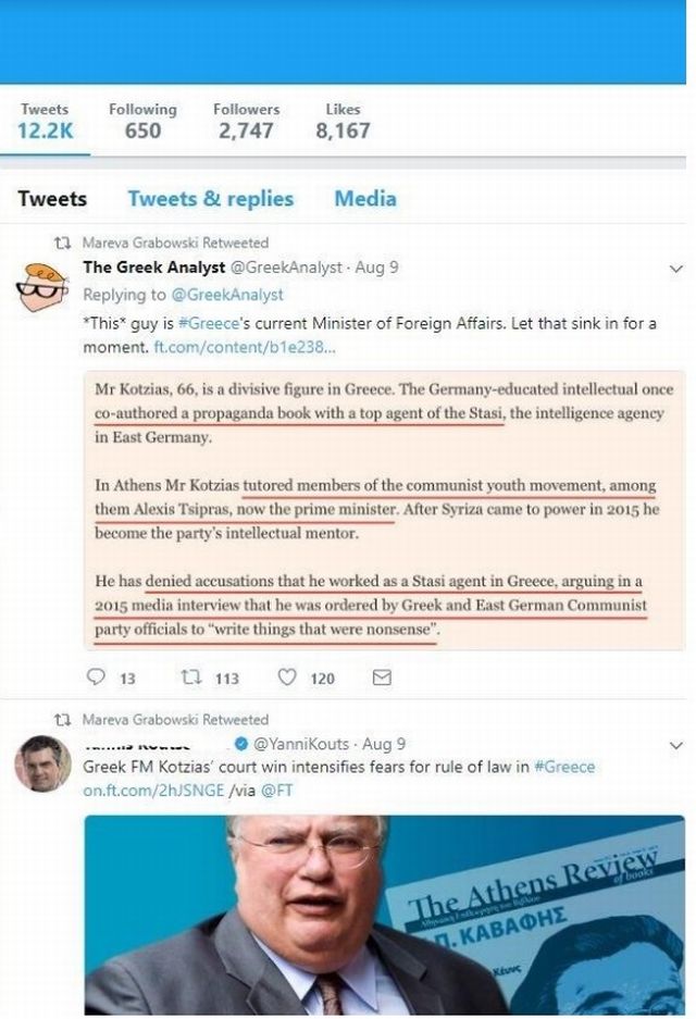 Η κ. Μαρέβα Γκραμπόφσκι, γνωστή για τη φωτογράφισή της στο πλάι του εκ των εγκεφάλων του μείζονος Μεταπολιτευτικού σκανδάλου της Siemens, Μιχάλη Χριστοφοράκου, και για προσωπικές σχέσεις της με την οικογένεια του έτερου στελέχους της Siemens, Διονύση Δενδρινού, και της συζύγου του, Ελένης Δενδρινού, όταν αυτή ήταν και προϊσταμένη της συζύγου του κ. Μητσοτάκη στο παράρτημα της Dresdner Bank στην Ελλάδα, τώρα απέκτησε και… πολιτικούς προβληματισμούς επί θεμάτων εξωτερικής πολιτικής και του προσώπου που είναι επικεφαλής της ελληνικής διπλωματίας, Νίκου Κοτζιά.