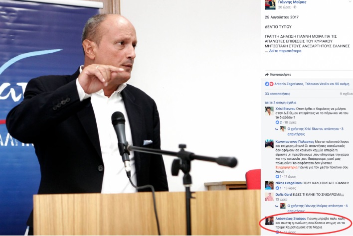 Δεν εγκρίνει τις επιλογές Μητσοτάκη ο πρώην υφυπουργός Γεωργίας κατά την πρωθυπουργία του Κων. Μητσοτάκη (1992-1993) και Γραμματέας της Κοινοβουλευτικής Ομάδας της ΝΔ επί Κώστα Καραμανλή (2004-2007), Απόστολος Σταύρου ο οποίος επαίνεσε στα μέσα κοινωνική δικτύωσης, δήλωση του Γιάννη Μοίρα στην οποία ο βουλευτής Ανεξαρτήτων Ελλήνων καταφέρεται εναντίον του Κυριάκου Μητσοτάκη και «των ακροδεξιών επιλογών του».