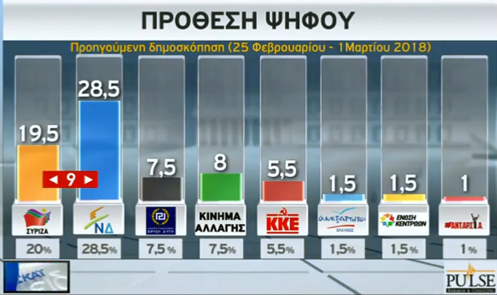 Σύμφωνα με την δημοσκόπηση της Pulse για τον ΣΚΑΙ η διαφορά Νέας Δημοκρατίας και ΣΥΡΙΖΑ κυμαίνεται στις 9 μονάδες με 28,5 η ΝΔ και 19,5 μονάδες ο ΣΥΡΙΖΑ , ενώ ακολουθούν Χρυσή Αυγή με 7,5 μονάδες, το Κίνημα Αλλαγής με 8 μονάδες το ΚΚΕ με 5,5 μονάδες και οι Ανεξάρτητοι Έλληνες και η Ένωση Κεντροών με 1,5 μονάδες.