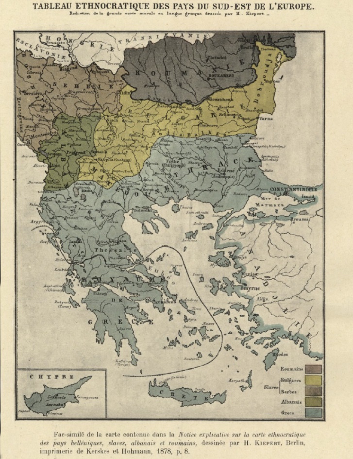 Χάρτης του 1878. Με μπλε χρώμα απεικονίζονται τα εδάφη με ελληνικούς πληθυσμούς ανεξάρτητα της γλώσσας ή της θρησκείας των ανθρώπων ελληνικής συνείδησης.