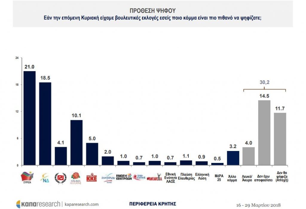 Πρώτο κόμμα στην Κρήτη θα ήταν ο ΣΥΡΙΖΑ αν την ερχόμενη Κυριακή είχαμε εκλογές. Αυτό απάντησε η πλειοψηφία των Κρητικών στην έρευνα της Κάπα Research για λογαριασμό του ΡΑΔΙΟ ΚΡΗΤΗ. Σύμφωνα με την έρευνα, ο ΣΥΡΙΖΑ έρχεται πρώτο κόμμα στην Κρήτη με ποσοστό 21% και ακολουθεί η Νέα Δημοκρατία με 18,5%.