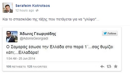 Ο βιβλιοπώλης και πρώην υπουργός Υγείας ανάρτησε ένα… χαρισματικό tweet στο οποίο έγραφε: «Ο Σαμαράς έσωσε την Ελλάδα στο παρά 1´…σας θυμίζει κάτι;…Ελλαδάρα!»