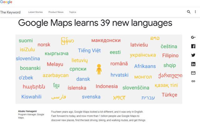 Στο πλαίσιο διεύρυνσης του πεδίου αναζήτησης της εφαρμογής Google maps, που χρησιμοποιούν 1 δισεκατομμύριο άνθρωποι σε όλον τον κόσμο, προστέθηκαν πρόσφατα 39 νέες γλώσσες.