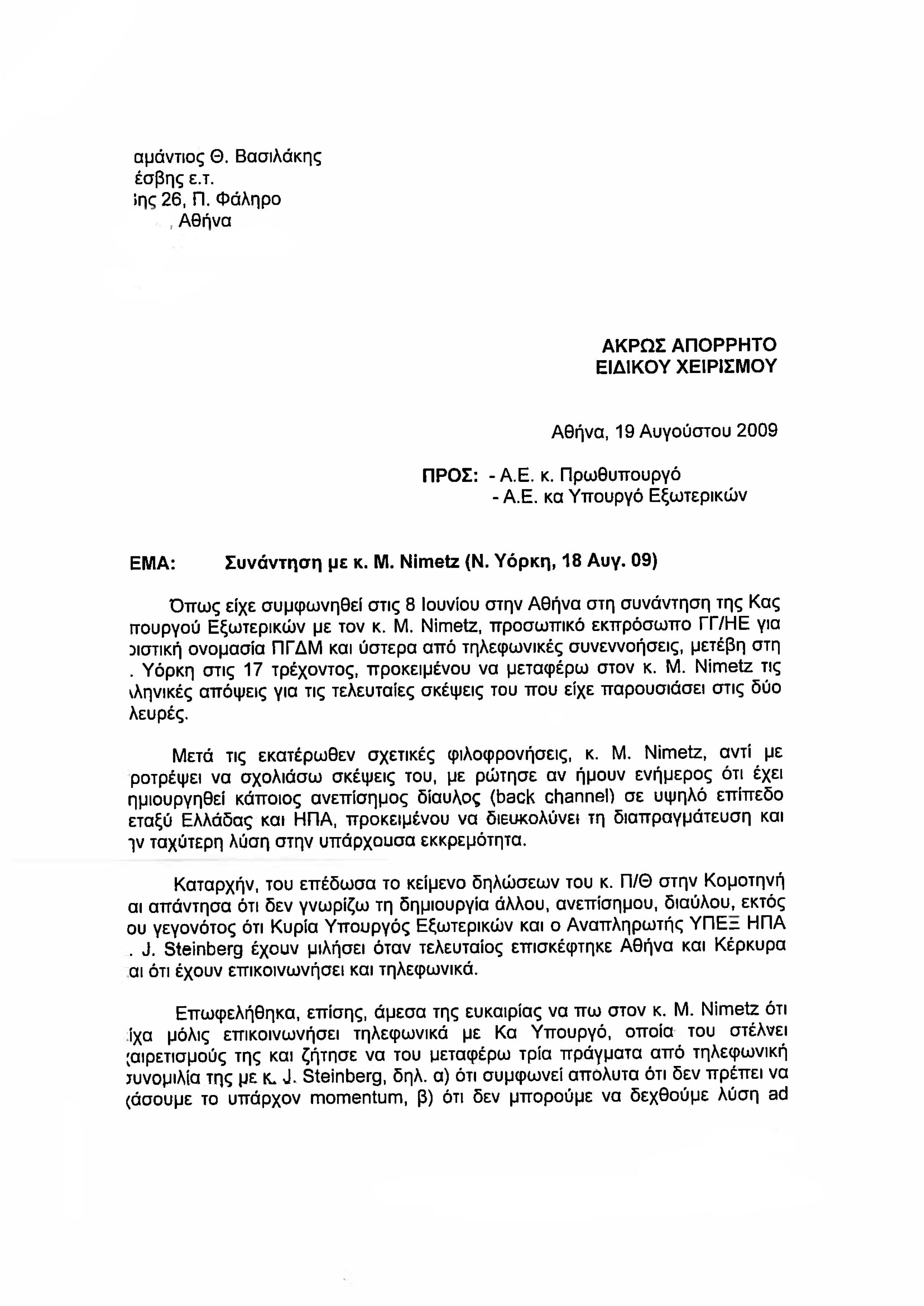 Στις 18 Αυγούστου του 2009, ο πρέσβης Αδαμάντιος Βασιλάκης είχε σταλεί από την υπουργό Εξωτερικών Ντόρα Μπακογιάννη σε συνάντηση με τον Νίμιτς στη Νέα Υόρκη. Μετά τη συνάντηση ενημέρωσε τον Κώστα Καραμανλή και την υπουργό για όσα ελέχθησαν.