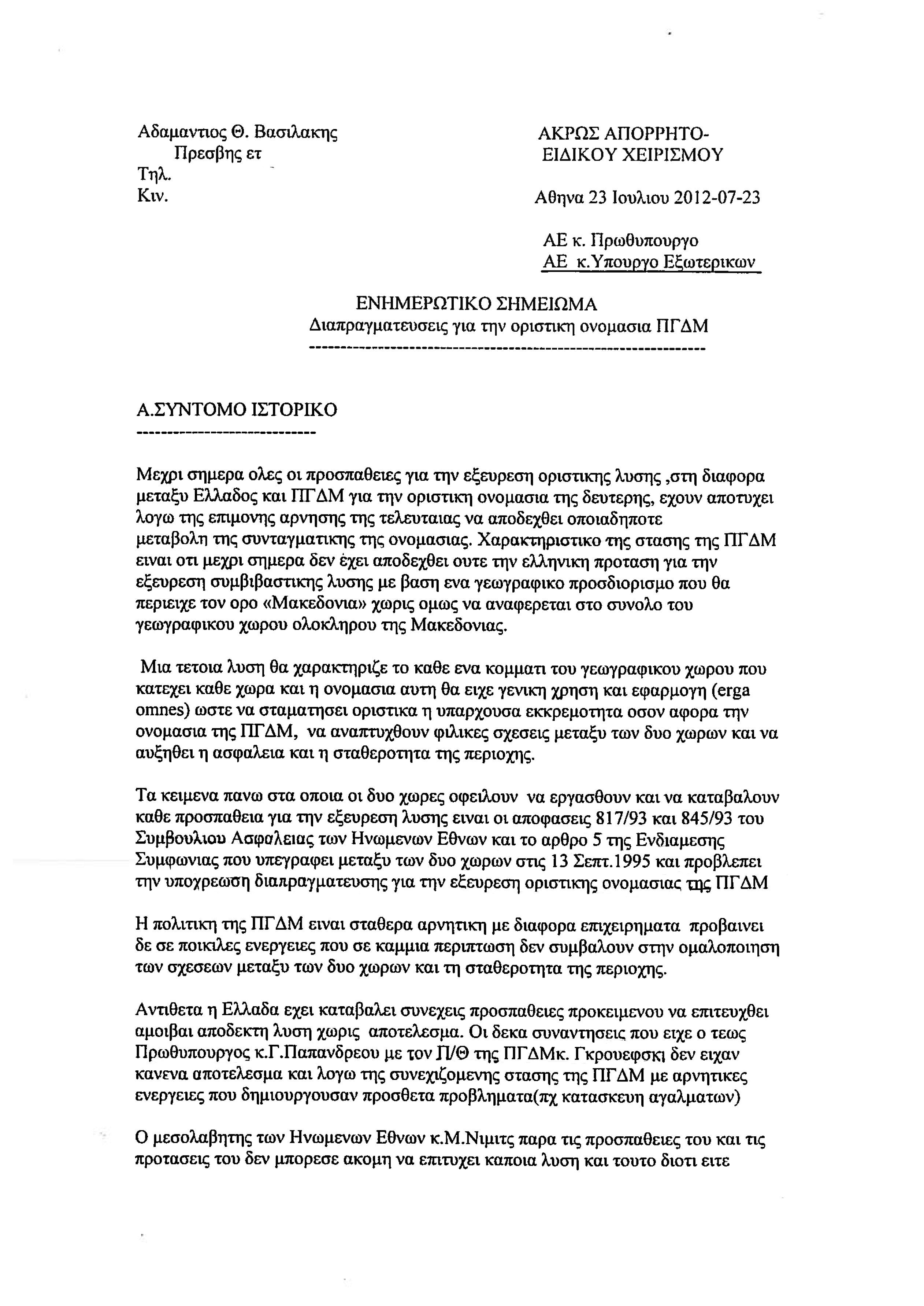 Απόρρητη έκθεση του Έλληνα διαπραγματευτή πρέσβη Αδαμάντιου Βασιλάκη προς τον πρωθυπουργό Αντώνη Σαμαρά, τον Ιούλιο του 2012, που φέρνει στο φως της δημοσιότητας η εφημερίδα Documento, αποκαλύπτει δύο πράγματα: αφενός πως η σημερινή συμφωνία Τσίπρα – Ζάεφ εξασφαλίζει για την Ελλάδα πράγματα για τα οποία έως τότε η πΓΔΜ ήταν αδιάλλακτη, αφετέρου πως ο Σαμαράς δεν επιχείρησε καμία ανατροπή της μέχρι τότε εξωτερικής πολιτικής για την οποία είχε ενημερωθεί πλήρως.
