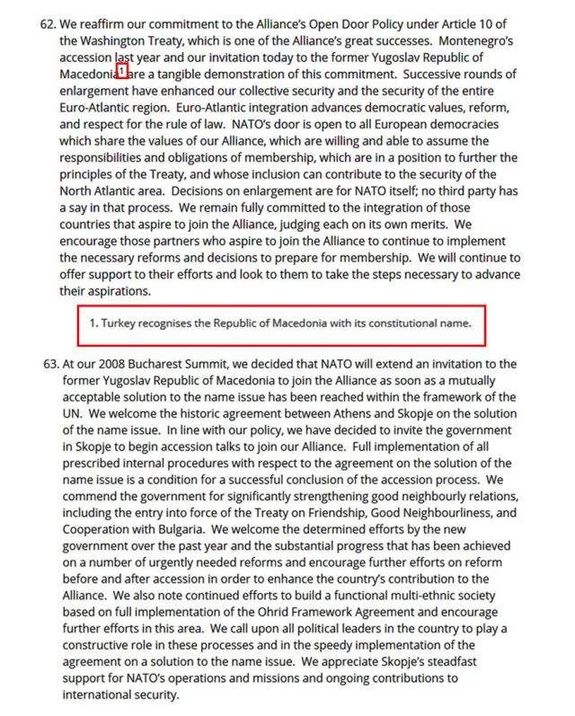 »Η πλήρης εφαρμογή όλων των προκαθορισμένων εσωτερικών διαδικασιών, με σεβασμό στη συμφωνία για την επίλυση του ονόματος, είναι προϋπόθεση για την επιτυχή ολοκλήρωση της ενταξιακής διαδικασίας» αναφέρεται στο σημείο 63 της κοινής δήλωσης που υπογράφουν όλοι οι ηγέτες των χωρών-μελών του ΝΑΤΟ.