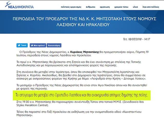 Πιστοί στο ραντεβού τους με τις επικοινωνιακές γκάφες εμφανίζεται και σήμερα ο Πρόεδρος της ΝΔ, Κυριάκος Μητσοτάκης και το στενό επιτελείο του, αυτή τη φορά με αφορμή την υποτιθέμενη αναγόρευσή του σε επίτιμο δημότη του Δήμου Οροπεδίου Λασιθίου.