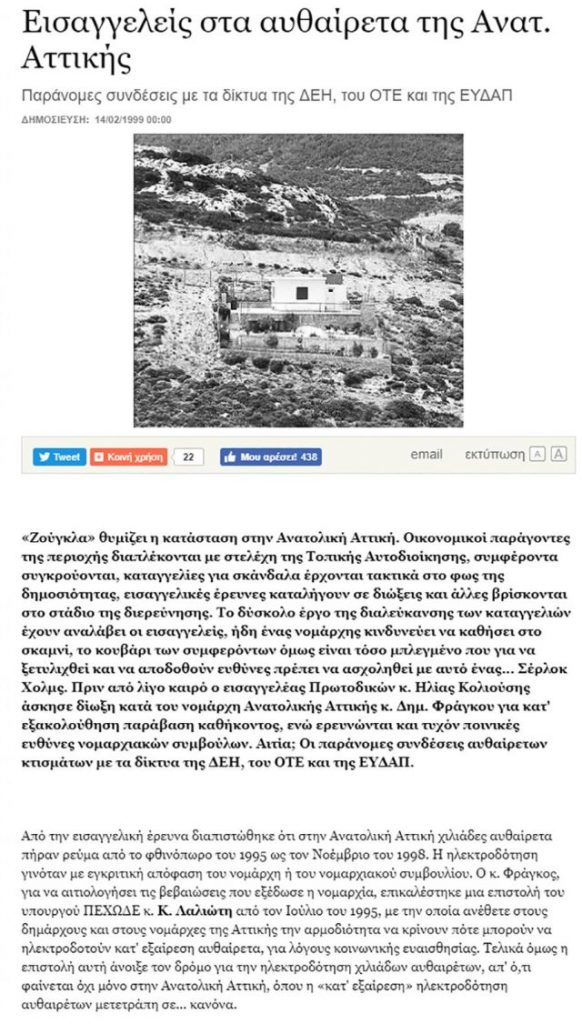 »Ο κ. Φράγκος, για να αιτιολογήσει τις βεβαιώσεις που εξέδωσε η νομαρχία, επικαλέστηκε μια επιστολή του υπουργού ΠΕΧΩΔΕ κ. Κ. Λαλιώτη από τον Ιούλιο του 1995, με την οποία ανέθετε στους δημάρχους και στους νομάρχες της Αττικής την αρμοδιότητα να κρίνουν πότε μπορούν να ηλεκτροδοτούν κατ’ εξαίρεση αυθαίρετα, για λόγους κοινωνικής ευαισθησίας.