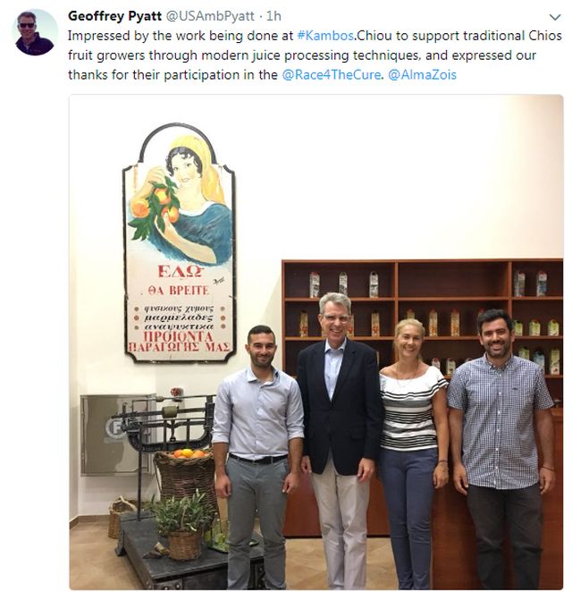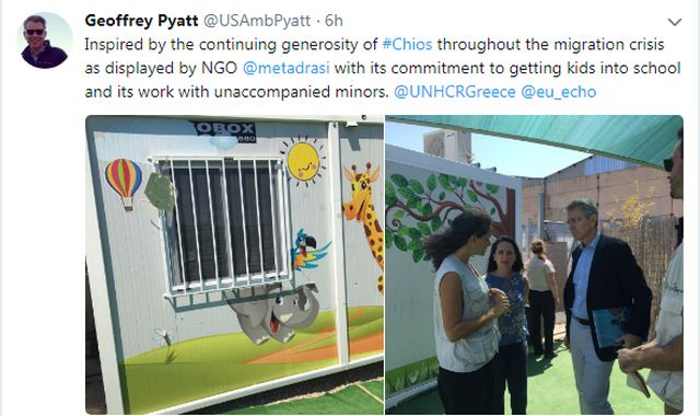 Σε σειρά αναρτήσεών του στο Twitter, ο κ. Πάιατ δήλωσε εντυπωσιασμένος από τα στελέχη της κυβέρνησης και των Μη Κυβερνητικών Οργανώσεων που διαχειρίζονται τη δύσκολη κατάσταση στο hotspot της ΒΙΑΛ, αλλά και από τη γενναιοδωρία που έδειξε η Χίος κατά τη διάρκεια της προσφυγικής και μεταναστευτικής κρίσης.