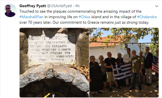 Δήλωσε επίσης συγκινημένος από τις πλάκες που έχουν τοποθετηθεί στο χωριό Χάλανδρα και οι οποίες μνημονεύουν την επίδραση του Σχεδίου Μάρσαλ στη βελτίωση της ζωής πολιτών στη Χίο, όπως σημειώνει σε σχετική ανάρτησή του στο Twitter.