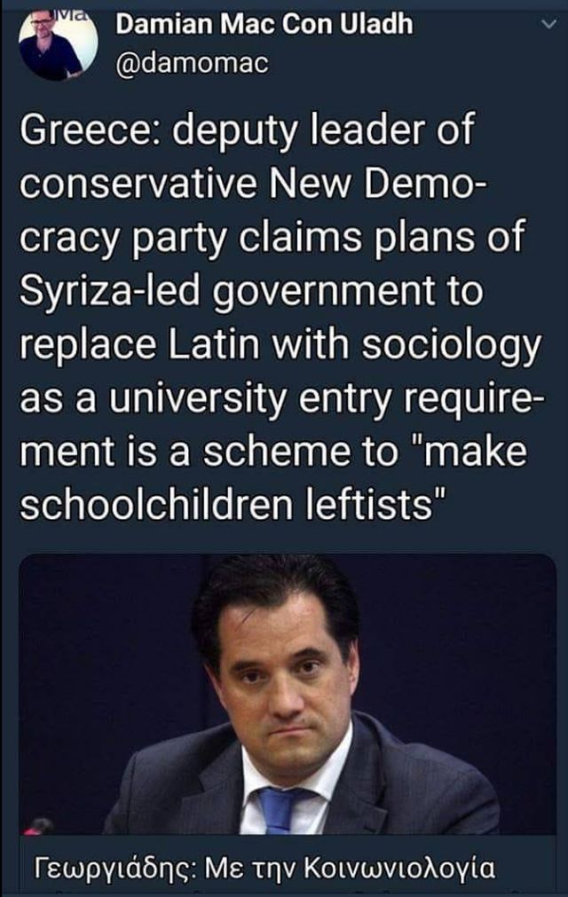 Οι γραφικοί ακροδεξιοί της Νέας Δημοκρατίας γίνονται αντικείμενο χλεύης και στο εξωτερικό. Ο ισχυρισμός του Άδωνι Γεωργιάδη ότι η διδασκαλία της κοινωνιολογίας κάνει τα παιδιά… αριστερά, κάνει τον γύρο του κόσμου στο Twitter με σκωπτικά σχόλια.