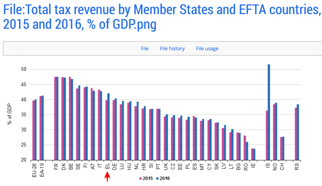 »Του παρουσιάζω λοιπόν τον πίνακα της Eurostat που αποτυπώνει τη θέση της Ελλάδας σε σχέση με τις υπόλοιπες χώρες της Ευρωζώνης και της ΕΕ για τα φορολογικά έσοδα κάθε χώρας ως προς το ΑΕΠ στον οποίο η Ελλάδα καταλαμβάνει την 8η θέση στην ΕΕ και την 6η στην Ευρωζώνη και πολύ κοντά στην Γερμανία και την Ολλανδία αλλά και το μέσο όρο των κρατών μελών της Ευρωζώνης: