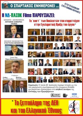 “Το ξεπούλημα της ΔΕΗ και του ελληνικού έθνους” μία ταινία της ΠΑΣΟΚ- ΝΔ films σημειώνει στην αφίσα που κυκλοφορεί στο διαδίκτυο το σωματείο των εργαζομένων την ΔΕΗ Σπάρτακος με τις φωτογραφίες των βουλευτών του πρώτου θερινού τμήματος που ψήφισαν το νομοσχέδιο της μικρής ΔΕΗ.