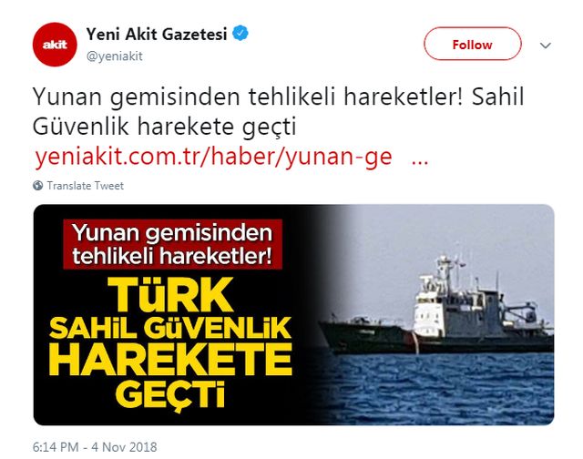 Οι Τούρκοι δημοσιεύουν τη φωτογραφία που αναδημοσιεύουμε, ως δήθεν του ελληνικού σκάφους που παραβίασε τα χωρικά τους ύδατα, το οποίο όμως εάν προσέξετε δεν έχει ελληνική σημαία.