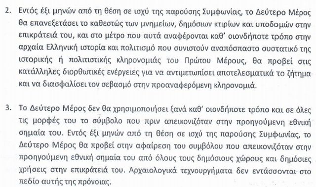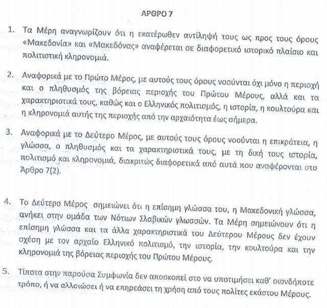«Τα μέρη σημειώνουν ότι η επίσημη γλώσσα και τα άλλα χαρακτηριστικά του Δεύτερου Μέρους (σ.σ. ΠΓΔΜ) δεν έχουν σχέση με τον αρχαίο ελληνικό πολιτισμό, την ιστορία, την κουλτούρα και την κληρονομιά της βόρειας περιοχής του Πρώτου Μέρους (σ.σ. Ελλάδας)».