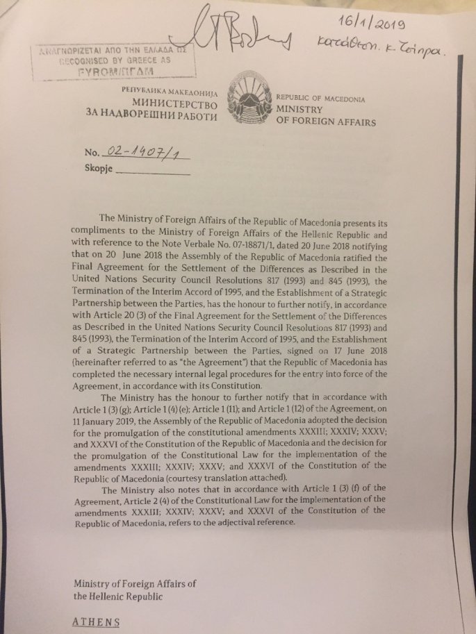 Άνοιξε ο δρόμος για να κυρωθεί η Συμφωνία των Πρεσπών από τη Βουλή των Ελλήνων, καθώς εστάλη στο υπουργείο Εξωτερικών η ρηματική διακοίνωση από την κυβέρνηση Ζάεφ, μέσω της οποίας ενημερώνεται η ελληνική πλευρά για την ολοκλήρωση των συνταγματικών διαδικασιών στη γειτονική χώρα.