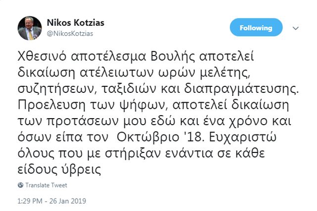 Για δικαίωση κάνει λόγο ο πρώην υπουργός Εξωτερικών Νίκος Κοτζιάς, αναφερόμενος στην κύρωση από τη Βουλή της Συμφωνίας των Πρεσπών.
