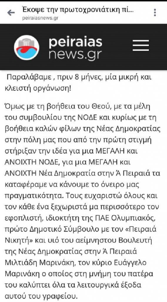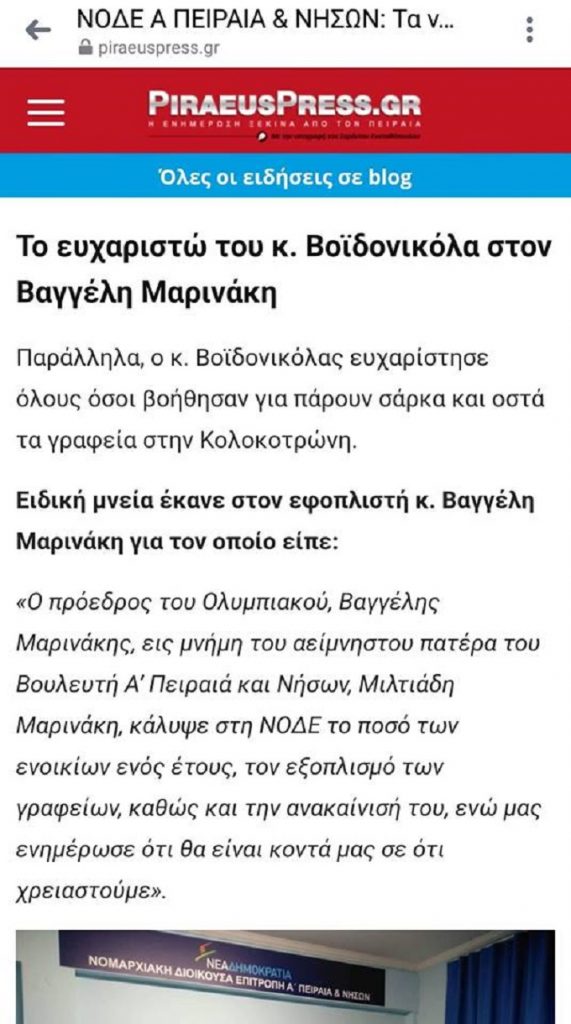 «Οι δημόσιες ευχαριστίες του γραμματέα της Ν.Δ. στον Πειραιά κ. Βοϊδονικόλα προς τον Βαγγέλη Μαρινάκη για την κάλυψη των ενοικίων, του εξοπλισμού και της ανακαίνισης των τοπικών γραφείων της ΝΔ αποτελεί καραμπινάτη ομολογία διαπλοκής που εκθέτει ανεπανόρθωτα τον Κυριάκο Μητσοτάκη», σημειώνει ο ΣΥΡΙΖΑ.