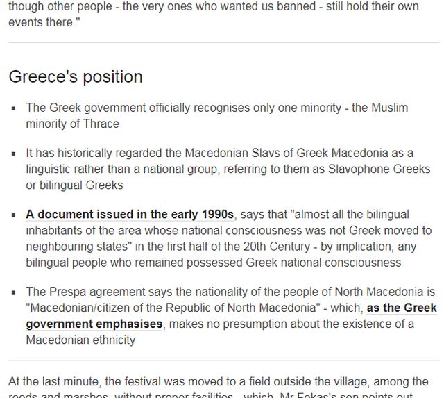»Ιστορικά θεωρεί τους Μακεδόνες Σλάβους ως γλωσσική και όχι εθνική ομάδα, αναφέροντάς τους ως σλαβόφωνους Έλληνες ή δίγλωσσους Έλληνες» τονίζει επίσης το BBC.