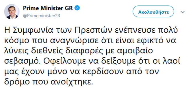 »Οφείλουμε να δείξουμε ότι οι λαοί μας έχουν μόνο να κερδίσουν από τον δρόμο που ανοίχτηκε», ήταν η ανάρτηση από τα Σκόπια στον λογαριασμό Twitter του Έλληνα πρωθυπουργού.