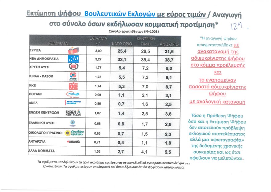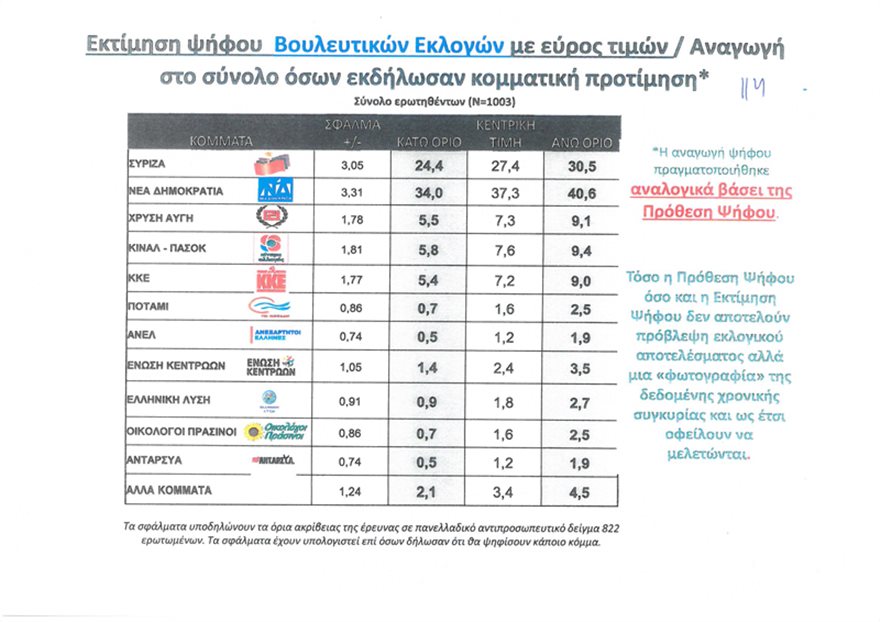 Ειδικότερα, η ΝΔ συγκεντρώνει 30,1% και ο ΣΥΡΙΖΑ 21,1% Ακολουθούν η Χρυσή Αυγή και το Κίνημα Αλλαγής με 6,2% αντίστοιχα, το ΚΚΕ με 5,5%, η Ένωση Κεντρώων με 2%, οι Οικολόγοι Πράσινοι με 1,9%, το Ποτάμι με 1,7%, η Ελληνική Λύση με 1,6%, οι ΑΝΕΛ με 1% και το ΜέΡΑ 25 με 1%. Στο 17,6% ανέρχεται η αδιευκρίνιστη ψήφος, ενώ άλλο κόμμα επιλέγει το 4,1%.