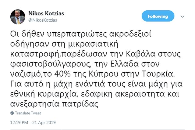 »Για αυτό η μάχη ενάντιά τους είναι μάχη για εθνική κυριαρχία, εδαφική ακεραιότητα και ανεξαρτησία πατρίδας» αναφέρει σε ανάρτησή του στον προσωπικό του λογαριασμό στο Twitter ο πρώην υπουργός Εξωτερικών Νίκος Κοτζιάς.