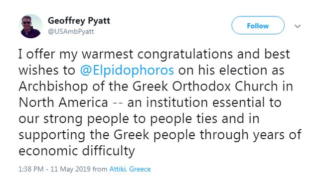 Τα θερμά του συγχαρητήρια προς τον νέο αρχιεπίσκοπο Αμερικής Ελπιδοφόρο εξέφρασε μέσω Twitter ο Αμερικανός πρεσβευτής στην Αθήνα Τζέφρι Πάιατ.