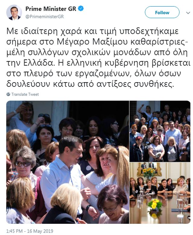 Σε ανάρτησή του στο twitter ο Αλ. Τσίπρας σχολίασε πως «η ελληνική κυβέρνηση βρίσκεται στο πλευρό των εργαζομένων, όλων όσων δουλεύουν κάτω από αντίξοες συνθήκες».