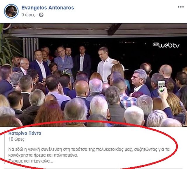 Ένα ποστ πριν είχε «μοιραστεί» ανάρτηση της Κατερίνας Πάντα, που σχολίαζε τη συγκέντρωση του Μητσοτάκη σε ταράτσα στη Φλώρινα, η οποία γράφει: