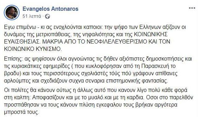 Το δικό του ξεκάθαρο μήνυμα προς τους ψηφοφόρους έστειλε ο Ευάγγελος Αντώναρος με νέα ανάρτησή του στο Facebook.