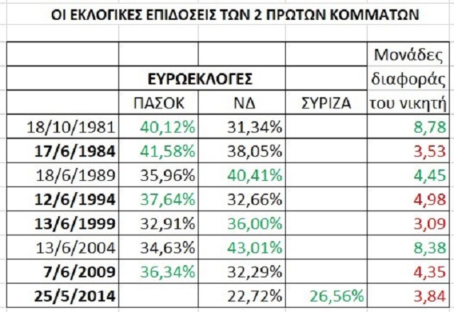Στον παρακάτω πίνακα φαίνονται τα ποσοστά και οι διαφορές μεταξύ των δυο πρώτων κομμάτων στις ευρωεκλογές από το 1981: