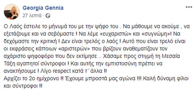 «Ο Λαός έστειλε το μήνυμά του με την ψήφο του. Να μάθουμε να ακούμε, να εξετάζουμε και να σεβόμαστε! Να λέμε “ευχαριστώ” και “συγνώμη”!» γράφει σε ανάρτησή της στο Facebook η σοσιαλπατριώτισσα βουλευτής Α Πειραιά του ΣΥΡΙΖΑ, Γεωργία Γεννιά και συνεχίζει: