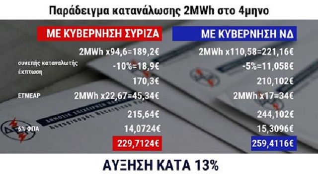 «Η ΝΔ προχωρά σε προαποφασισμένες αυξήσεις στα τιμολόγια της ΔΕΗ, οδηγώντας σε υπέρογκες επιβαρύνσεις για νοικοκυριά και επιχειρήσεις» επισήμανε σε ανάρτηση του στο Facebook, ο εκπρόσωπος τύπου του ΣΥΡΙΖΑ, Αλέξης Χαρίτσης, δημοσιεύοντας πίνακα με τις προαποφασισμένες αυξήσεις που επιβάλει η κυβέρνηση της Νέας Δημοκρατίας.