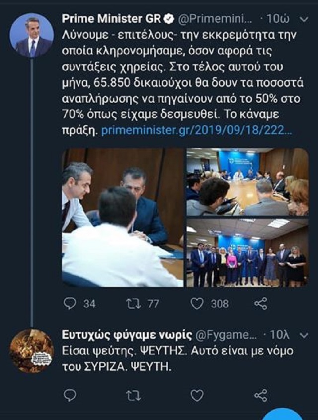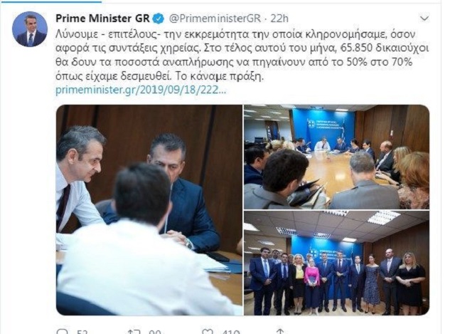 Προηγήθηκε ανάρτηση του πρωθυπουργού Κυριάκου Μητσοτάκη στο Twitter με την οποία άφηνε να εννοηθεί πως οι αυξήσεις για τις συντάξεις χηρείας είναι έργο της κυβέρνησης της ΝΔ!