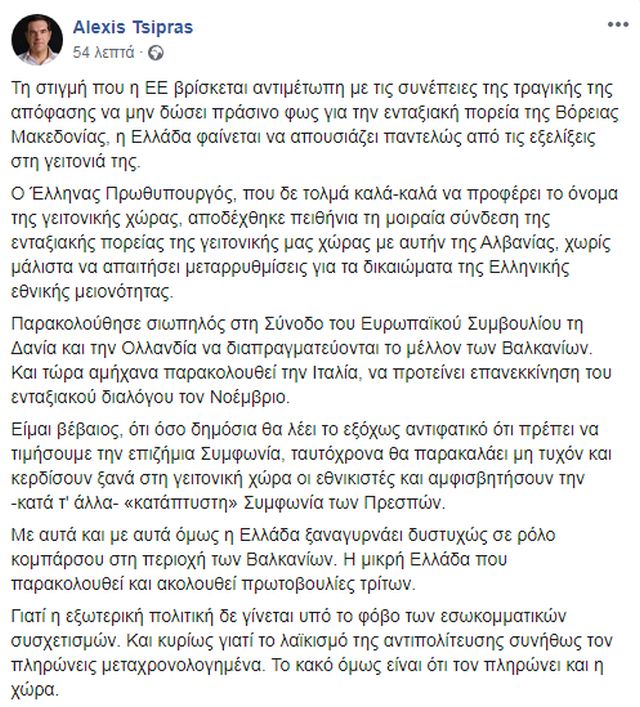 Στην «τραγική», όπως τη χαρακτηρίζει, ευρωπαϊκή απόφαση να μην δώσει πράσινο φως για την ενταξιακή πορεία της Βόρειας Μακεδονίας αναφέρεται σε ανάρτησή του στο Facebook ο πρόεδρος του ΣΥΡΙΖΑ και πρώην πρωθυπουργός Αλέξη Τσίπρας, τονίζοντας πως «η Ελλάδα φαίνεται να απουσιάζει παντελώς από τις εξελίξεις στη γειτονιά της».