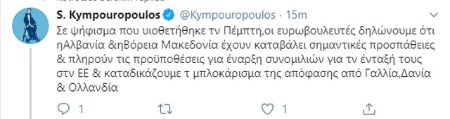 Ο κ. Κυμπουρόπουλος έγραψε χαρακτηριστικά «σε ψήφισμα που υιοθετήθηκε την Πέμπτη, οι ευρωβουλευτές δηλώνουμε ότι η Αλβανία και η Βόρεια Μακεδονία έχουν καταβάλει σημαντικές προσπάθειες και πληρούν τις προϋποθέσεις για έναρξη συνομιλιών για την ένταξή τους στην Ε.Ε. και καταδικάζουμε το μπλοκάρισμα της απόφασης από Γαλλία, Δανία και Ολλανδία».