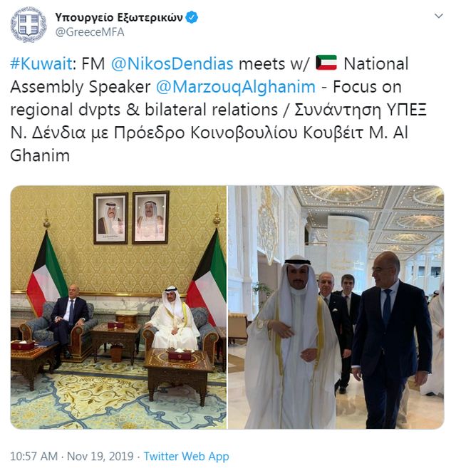 Νωρίτερα την Τρίτη, ο κ. Δένδιας είχε συνάντηση με τον πρόεδρο του κοινοβουλίου του Κουβέιτ Μαρτζούκ αλ-Γκανίμ και σύμφωνα με ανάρτηση στον επίσημο λογαριασμό του υπουργείου Εξωτερικών στο Τwitter, συζητήθηκαν οι περιφερειακές εξελίξεις και οι διμερείς σχέσεις.