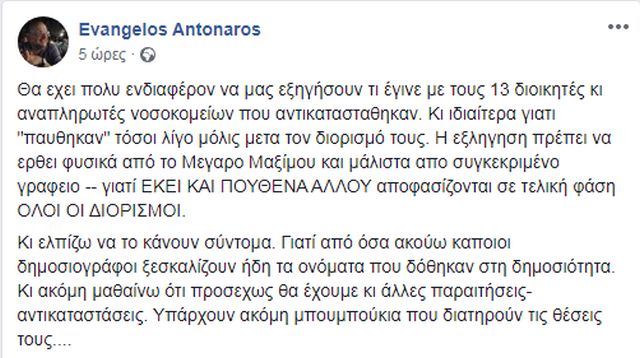 «Θα έχει πολύ ενδιαφέρον να μας εξηγήσουν τι έγινε με τους 13 διοικητές κι αναπληρωτές νοσοκομείων που αντικαταστάθηκαν.