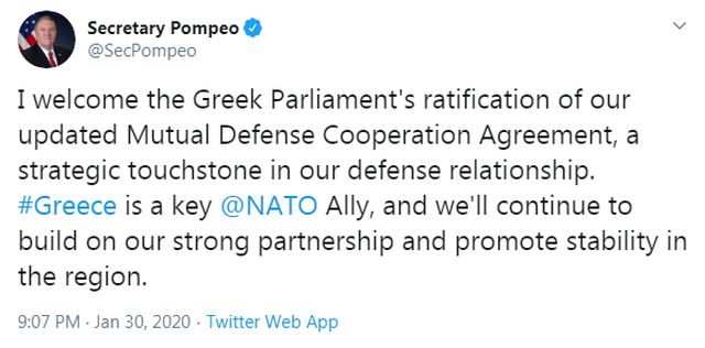 Την υπερψήφιση της επικαιροποιημένης Συμφωνίας Αμοιβαίας Αμυντικής Συνεργασίας (MDCA) από το ελληνικό κοινοβούλιο χαιρέτισε με ανάρτηση του στο Twitter ο Αμερικανός υπουργός Εξωτερικών Μάικ Πόμπεο.