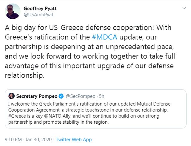 »Με την ελληνική έγκριση της επικαιροποιημένης MDCA, η συνεργασία μας εμβαθύνεται με ένα πρωτοφανή ρυθμό και αναμένουμε να συνεργαστούμε για να επωφεληθούμε πλήρως αυτή τη σημαντική αναβάμιση της αμυντικής μας σχέσης», δήλωσε ο Πάιατ, κοινοποιώντας την ανάρτηση του Αμερικανού ΥΠΕΞ Πομπέο.