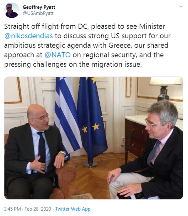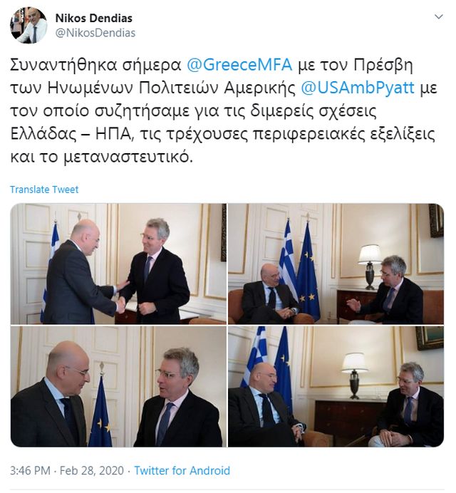 «Συναντήθηκα σήμερα στο υπουργείο Εξωτερικών με τον Πρέσβη των Ηνωμένων Πολιτειών Αμερικής Τζέφρι Πάιατ, με τον οποίο συζητήσαμε για τις διμερείς σχέσεις Ελλάδας – ΗΠΑ, τις τρέχουσες περιφερειακές εξελίξεις και το μεταναστευτικό».