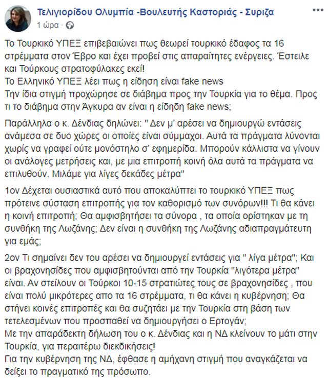 Μια σειρά από ερωτήματα, σχετικά με την τουρκική επιθετικότητα στον Έβρο, θέτει η πρώην υπουργός και βουλευτής Καστοριάς του ΣΥΡΙΖΑ, Ολυμπία Τελιγιορίδου.