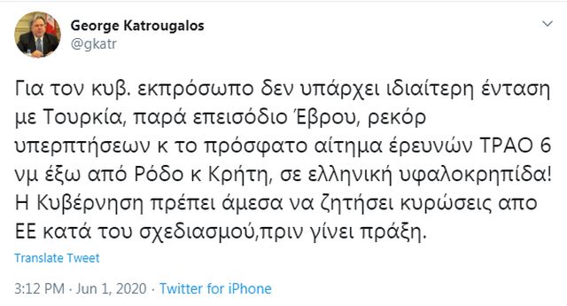 «Για τον κυβ. εκπρόσωπο δεν υπάρχει ιδιαίτερη ένταση με Τουρκία, παρά επεισόδιο Έβρου, ρεκόρ υπερπτήσεων κ το πρόσφατο αίτημα ερευνών TPAO 6 νμ έξω από Ρόδο κ Κρήτη, σε ελληνική υφαλοκρηπίδα!