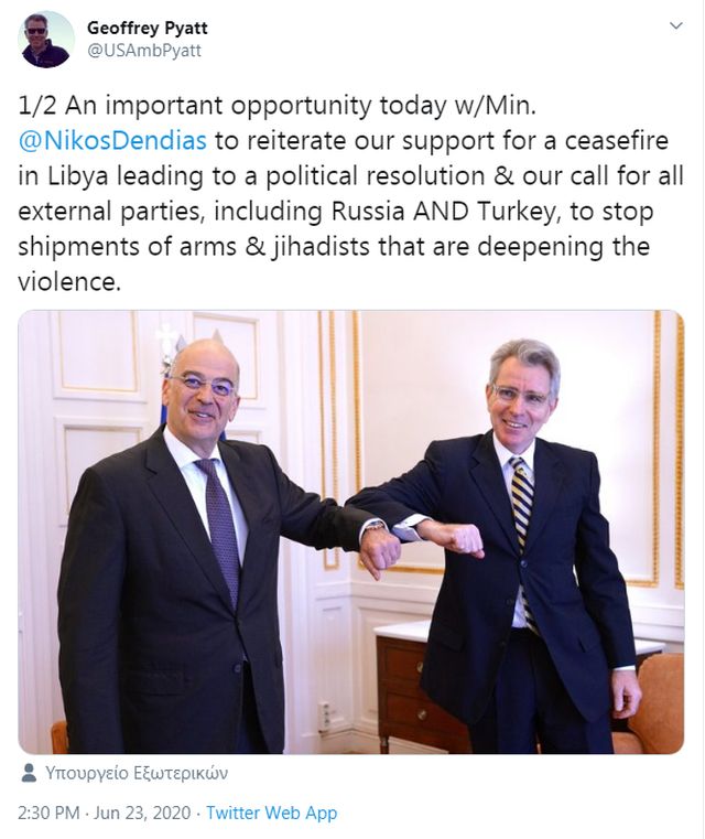 Όπως έγραψε στο Twitter o Αμερικανός Πρεσβευτής, «επαναλάβαμε την υποστήριξή μας σε μια κατάπαυση του πυρός στη Λιβύη που θα οδηγήσει σε μια πολιτική λύση» και το το αίτημα προς όλες τις ξένες εμπλεκόμενες δυνάμεις, «συμπεριλαμβανομένων Ρωσίας και Τουρκίας, να σταματήσουν τις αποστολές όπλων και τζιχαντιστών που εντείνουν τη βία».