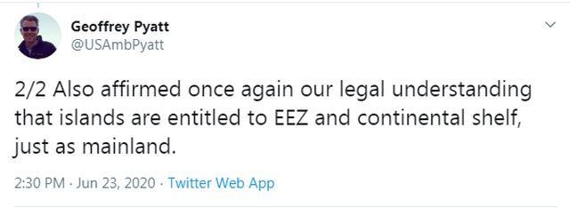 Ο Τζέφρι Πάιατ «επιβεβαίωσε επίσης για άλλη μια φορά τη νομική μας αντίληψη ότι τα νησιά δικαιούνται ΑΟΖ και υφαλοκρηπίδα, όπως και η ηπειρωτική χώρα».