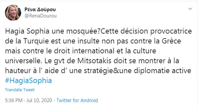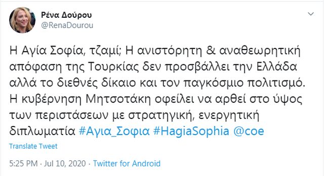 Ηχηρή αντίδραση από τη Ρένα Δούρου στην είδηση μετατροπής της Αγίας Σοφίας σε τζαμί. Η πρώην περιφερειάρχης Αττικής χαρακτήρισε «ανιστόρητη και αναθεωρητική» την απόφαση μετατροπής της Αγίας Σοφίας σε τζαμί, που προσβάλει το διεθνές δίκαιο και τον παγκόσμιο πολιτισμό.