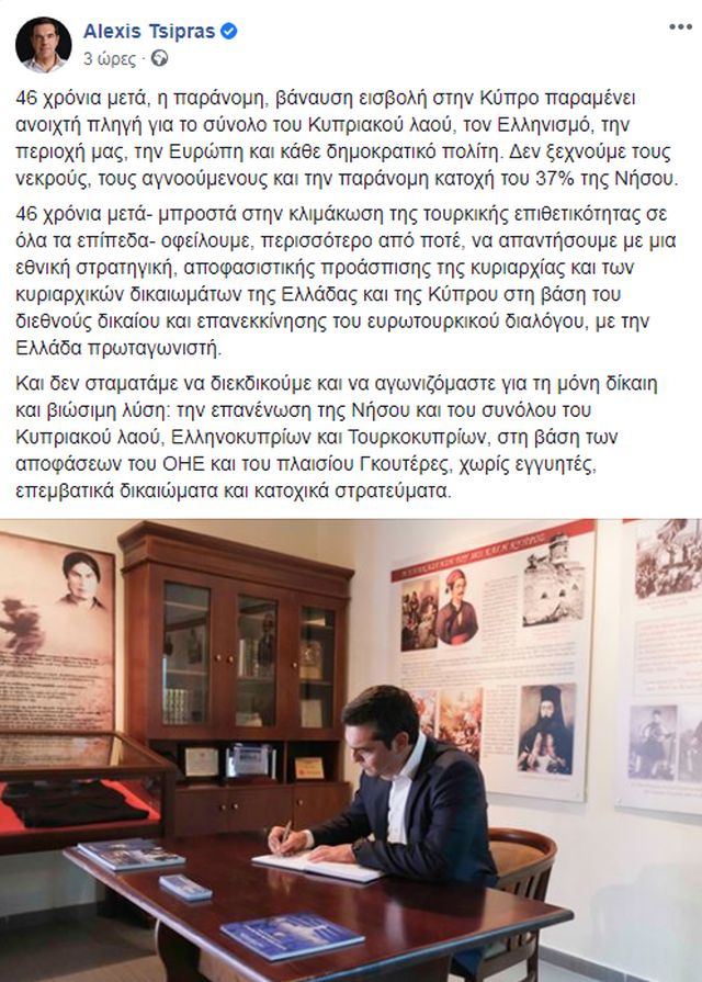 «46 χρόνια μετά, η παράνομη, βάναυση εισβολή στην Κύπρο παραμένει ανοιχτή πληγή για το σύνολο του Κυπριακού λαού, τον Ελληνισμό, την περιοχή μας, την Ευρώπη και κάθε δημοκρατικό πολίτη.