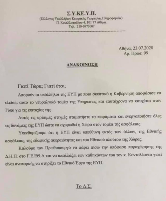 »Ο σύλλογος υπαλλήλων της Κεντρικής Υπηρεσίας Πληροφοριών, απαιτεί από τον Πρωθυπουργό την αποπομπή του διοικητή της ΕΥΠ, κ.Κοντολέοντα λόγω ανεπάρκειας.