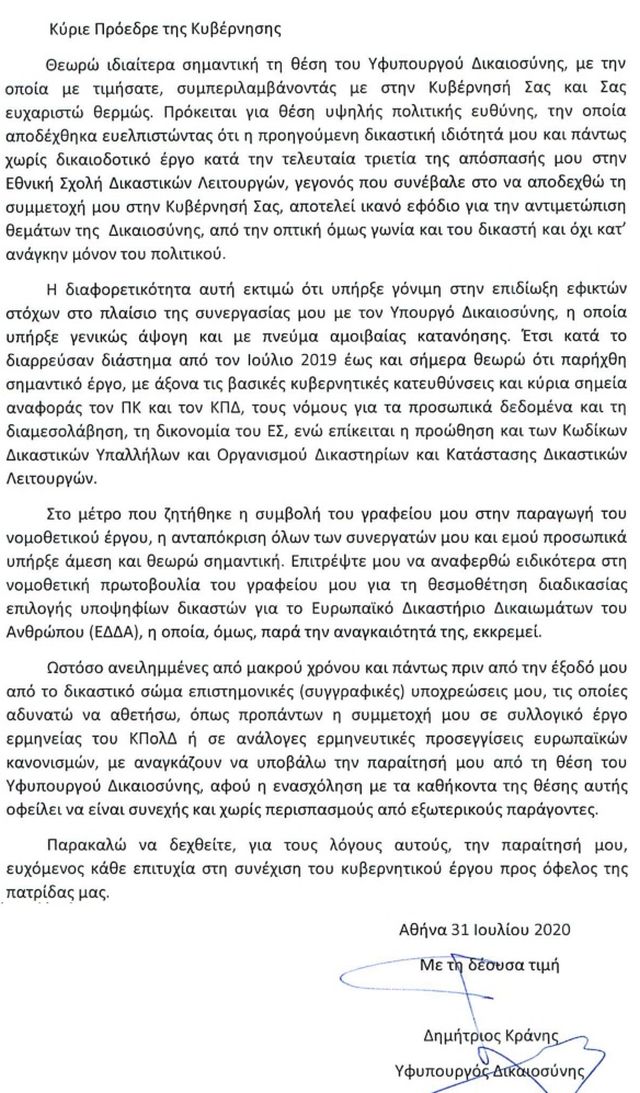 Στην επιστολή του, η οποία επιβεβαιώνει τον Στέλιο Πέτσα, ο κ. Κράνης αναφέρει μεταξύ άλλων ότι «Ανειλημμένες από μακρού χρόνου και πάντως πριν από την έξοδό μου από το δικαστικό σώμα, επιστημονικές υποχρεώσεις μου, τις οποίες αδυνατώ να αθετήσω, όπως προπάντων η συμμετοχή μου σε συλλογικό έργο ερμηνείας του ΚΠολΔ ή σε ανάλογες ερμηνευτικές προσεγγίσεις μου από τη θέση του υφυπουργού Δικαιοσύνης, με αναγκάζουν να υποβάλλω την παραίτησή μου».